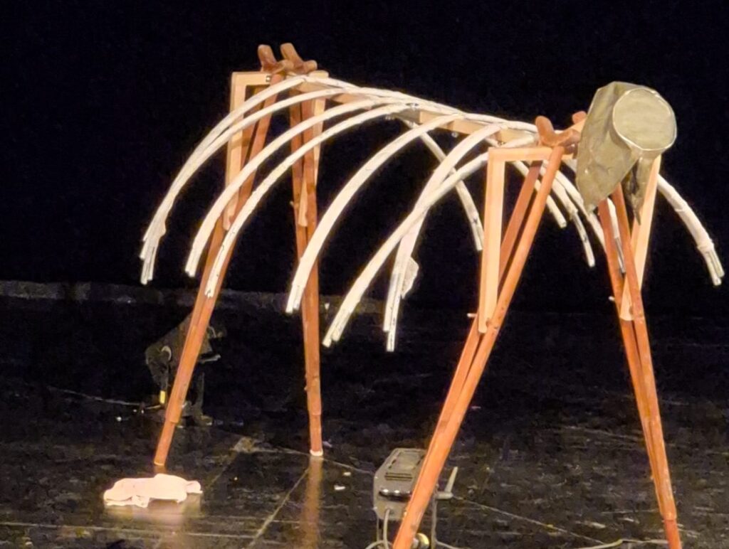 Lavastus on rakennettu siten, että se on mahdollisimman helppo siirtää mille näyttämölle tahansa. Keskeisessä roolissa on lehmä. Sen jalkoja kuvaavat nerokkaasti kainalosauvat ja laihuutta törröttävät kylkiluut. Kuva teatterin arkistosta.