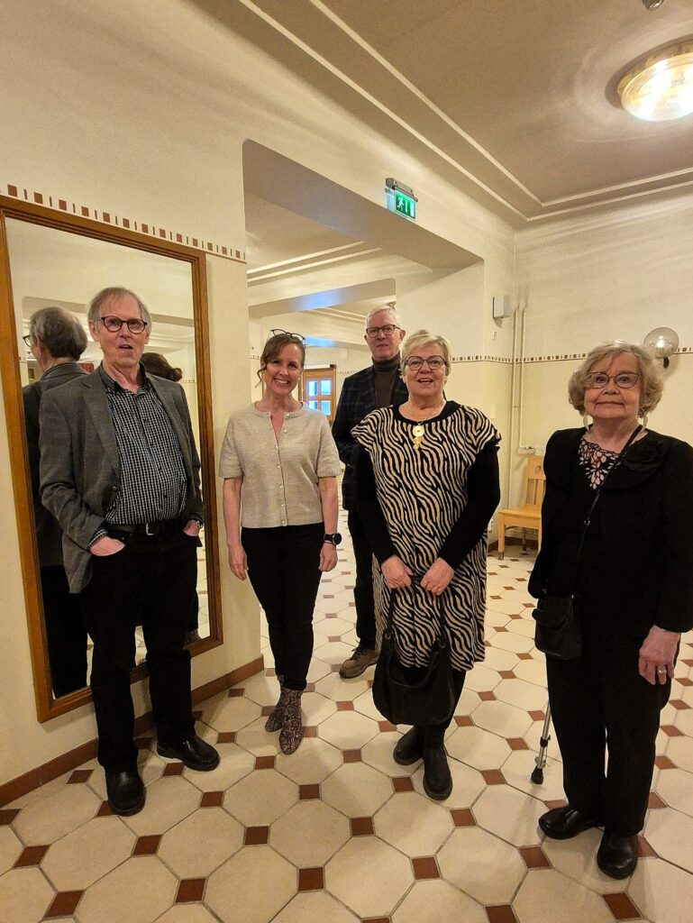 Marita Holkerin ottama kuva teatterin aulassa. Vasemmalta Martti, Lotta, Lassi, Terttu ja Eeva-Liisa