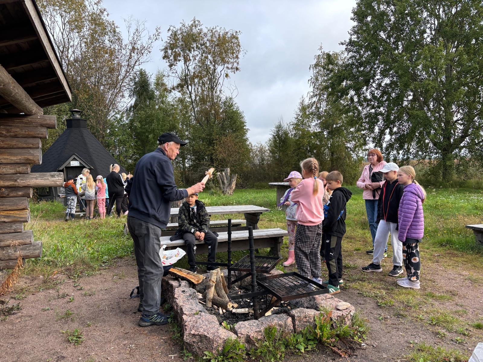 Tulipaikalla Raimo Savioja esitteli makkaranuotion sytyttämisen niksejä. Kiehiset ja tervaspuut tulivat tutuiksi. Mietittiin, minne saa tulen tehdä ja missä Köyliössä on tulentekopaikkoja. Pohdittiin myös maastopalovaroituksen merkitystä.