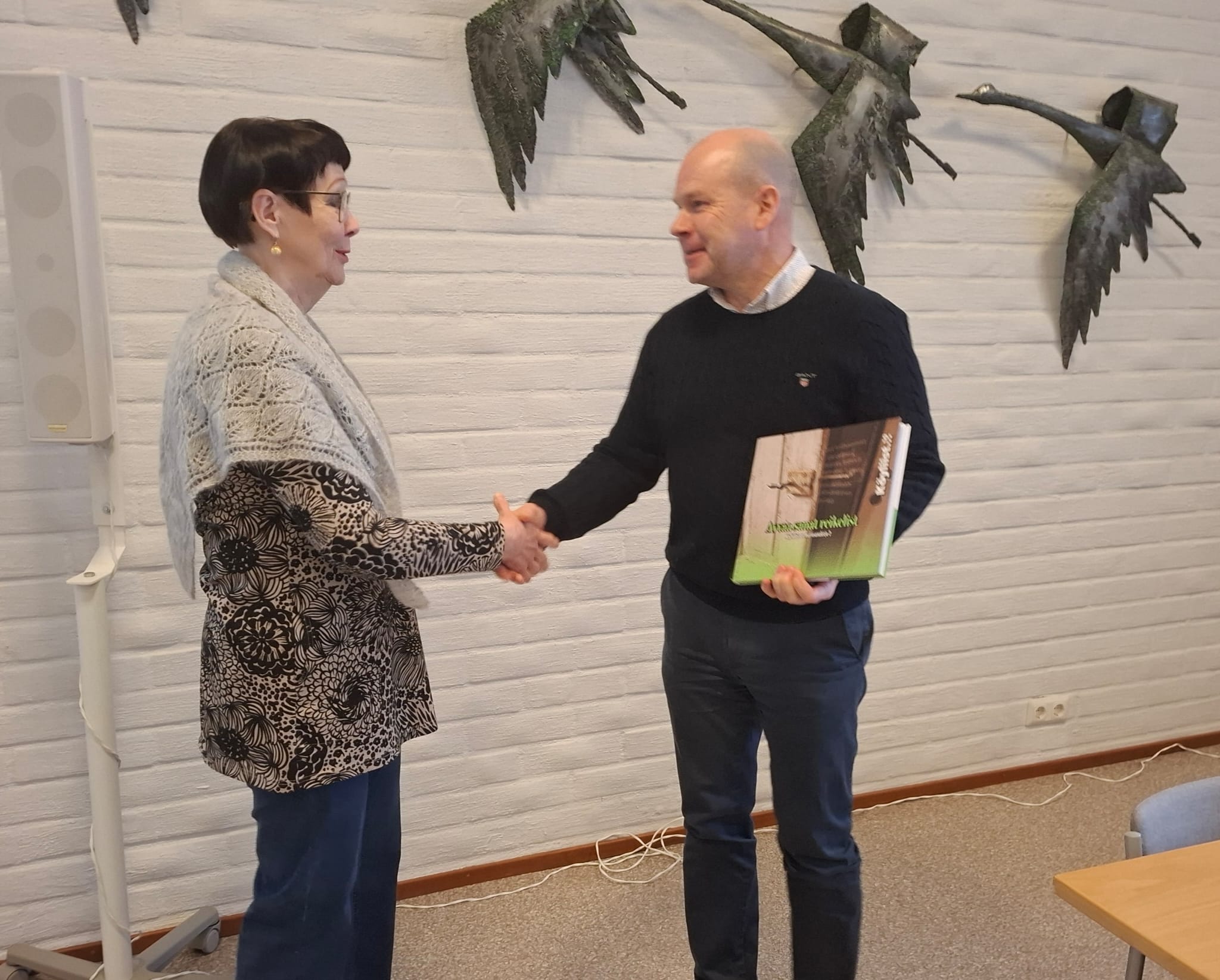 Puheenjohtaja Asser Lehtoranta lahjoitti esitelmän pitäjälle kaksi Köyliist’-kirjaa; Köyliist’ -12 ja Köyliist’-13.