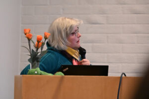 Noin klo 14.30 tutkija ja bioarkeologian dosentti Ulla Nordfors Turun yliopistosta kertoi, mitä uudet tutkimukset Köyliönsaaren merovingiaikaisista haudoista paljastavat. Tässä vaiheessa tupsahti sisään vielä iso joukko aiheesta kiinnostuneita, mutta kaikille löydettiin tuolit.